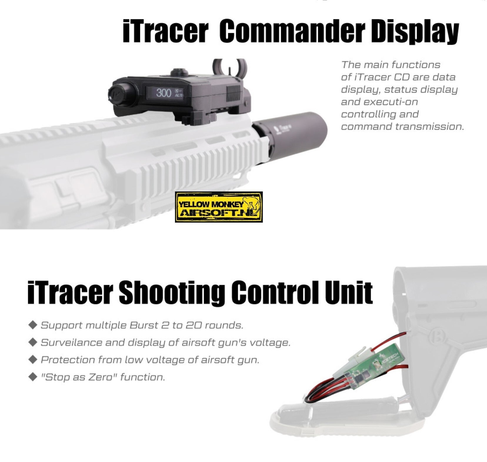 ModeliTracerPoweriTracer Unit: AAA battery x 4 Commander Display: AA battery x 2WeightiTracer Unit: 140g Commander Display: 70gDimensionsiTracer Unit: 156mm x 37mm Commander Display: 105.5mm x 67.5mm x 35mmiTracer UnitStandard Airsoft 14mm(-) negative thread tracer made of high-quality aluminum.Commander Display (CD, modeled on PEQ box)Could be mounted onto standard 20mm / Picatinny / Weaver rails
