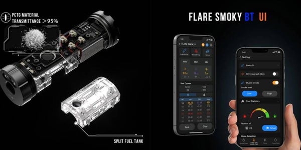 De Flare Smokey BT, een nieuwe versie van de populaire Flare-tracer, is voorzien van een rookgenerator. Dankzij de robuuste behuizing en verbeterde technologie elimineert hij lekkages van rookvloeistof en werkt hij op een lager vermogen voor een lange batterijduur.